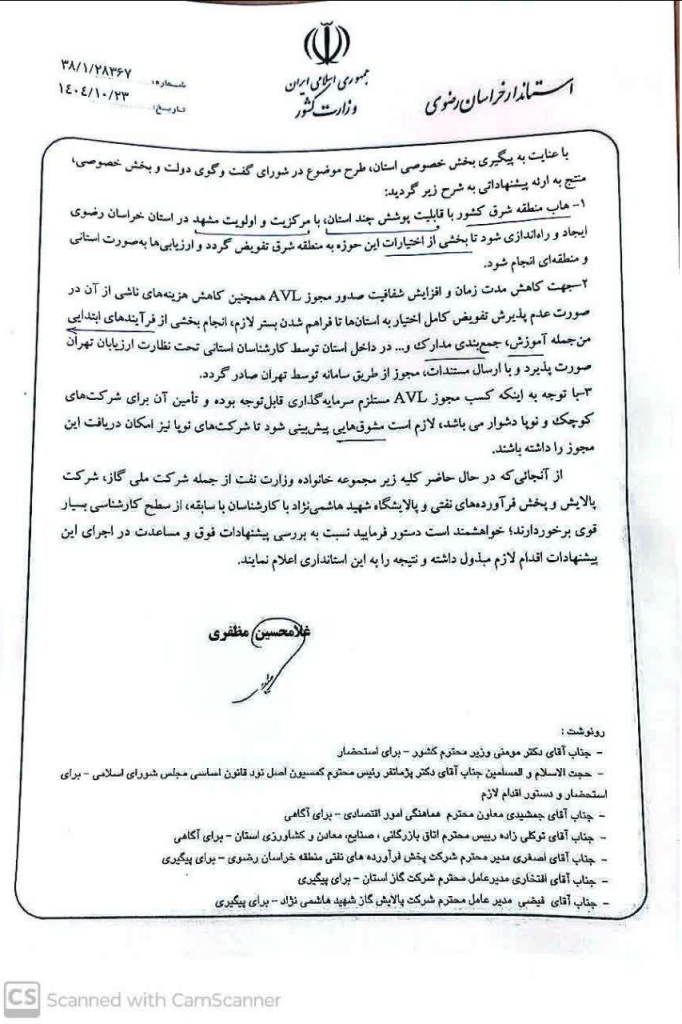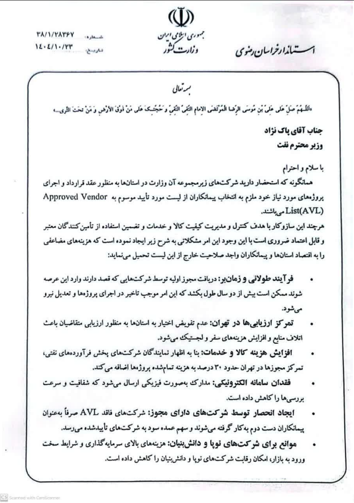غلامحسین مظفری، استاندار خراسان رضوی، با ارسال نامهای رسمی به وزیر نفت، بسته تصمیمساز اصلاح فرآیند صدور مجوز تأمینکنندگان معتبر وزارت نفت (AVL) را که توسط خانه همافزایی انرژی و آب خراسان رضوی و با پشتیبانی و مصوبه شورای گفتوگوی دولت و بخش خصوصی استان تدوین شده است، برای بررسی و اقدام اجرایی به وزارت نفت ارائه کرد.