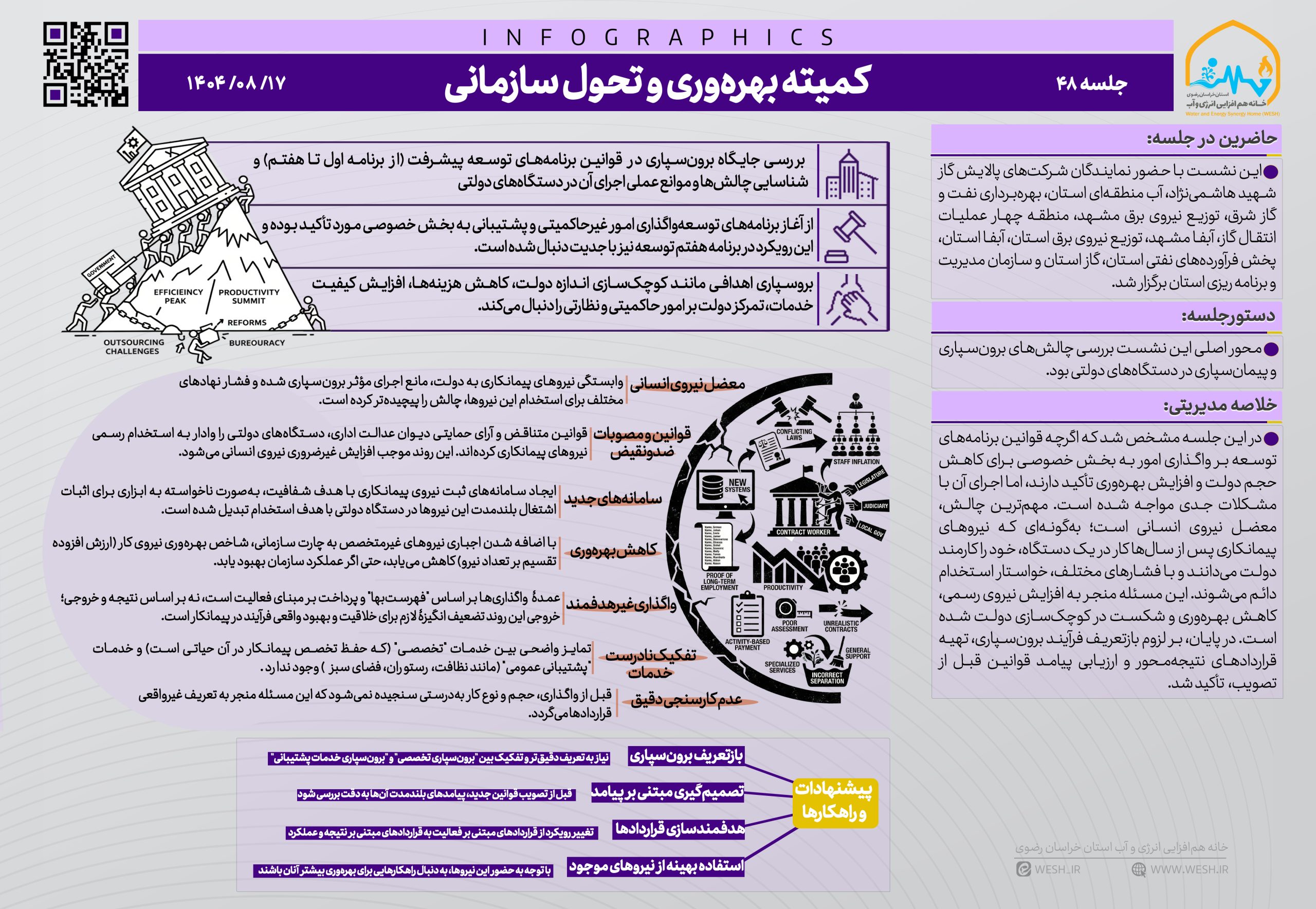 جلسه چهلوهشتم کمیته بهرهوری با حضور نمایندگان شرکتهای پالایش گاز شهید هاشمینژاد، آب منطقهای خراسان رضوی، بهرهبرداری نفت و گاز شرق، توزیع نیروی برق مشهد، منطقه چهار عملیات انتقال گاز، شرکت آب و فاضلاب مشهد، شرکت آب و فاضلاب استان، شرکت توزیع نیروی برق استان، شرکت ملی پخش فرآوردههای نفتی خراسان رضوی، شرکت گاز استان و سازمان مدیریت و برنامهریزی خراسان رضوی برگزار شد. این نشست با تمرکز بر بررسی وضعیت برونسپاری و پیمانسپاری در دستگاههای دولتی، به واکاوی چالشها، نارساییهای حقوقی و پیامدهای ساختاری این سیاست پرداخت.