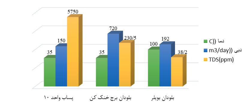نیروگاه ایرانشهر، واقع در استان سیستان و بلوچستان، شامل نیروگاه بخار قدیمی با چهار واحد 64 مگاواتی و نیروگاه سیکل ترکیبی جدید با ظرفیت 484 مگاوات است. در این مطالعه، سه جریان پساب این نیروگاه مورد بررسی قرار گرفته و ویژگیهای آنها از جمله دبی، دما و TDS در شکل 2 ارائه شده است.