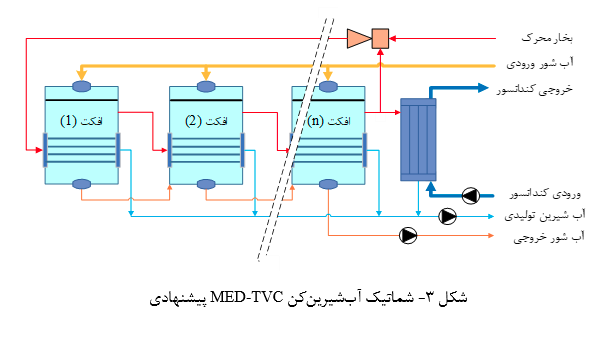 شاهونی و همکاران[9] در سال 2024 به بررسی و مدلسازی آب شیرین کن MED-TVC با استفاده از گرمای هدررفت (یا هیتر برقی) برای بهبود بازده سیستم ترکیبی را مورد بررسی قرار دادند.
