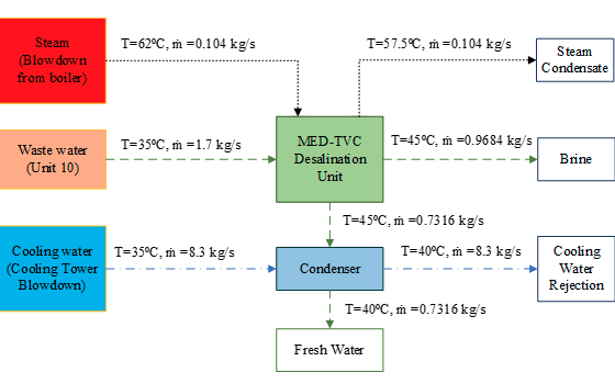 در طرح پیشنهادی (شکل 3)، بخار بلودان بویلر بهعنوان ورودی به آبشیرینکن وارد میشود و پساب واحد 10 (آب شور ورودی) مستقیماً به افکتهای سیستم تزریق میگردد. در همین حال، بلودان برجهای خنککننده که به کندانسور وارد میشوند، تنها به منظور تأمین سرمایش کندانسور مورد استفاده قرار میگیرند.