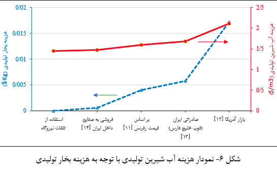 از آنجایی که بخار مورد نیاز واحد آبشیرینکن از حرارت تلفشده نیروگاه تأمین میگردد، در فرآیند مدلسازی هزینهای برای آن در نظر گرفته نشده است. با این حال، جهت تحلیل واقعبینانهتر، هزینه تولید بخار بر اساس قیمتهای مختلف گاز (داخلی، صادراتی و بازار آمریکا) محاسبه شده و اثر آن بر بهای تمامشده آب بررسی شده است. علاوه بر این، به منظور مقایسه، هزینه بخار گزارششده در مطالعه العبیدی و همکاران [11] نیز مدنظر قرار گرفته است(شکل 6).