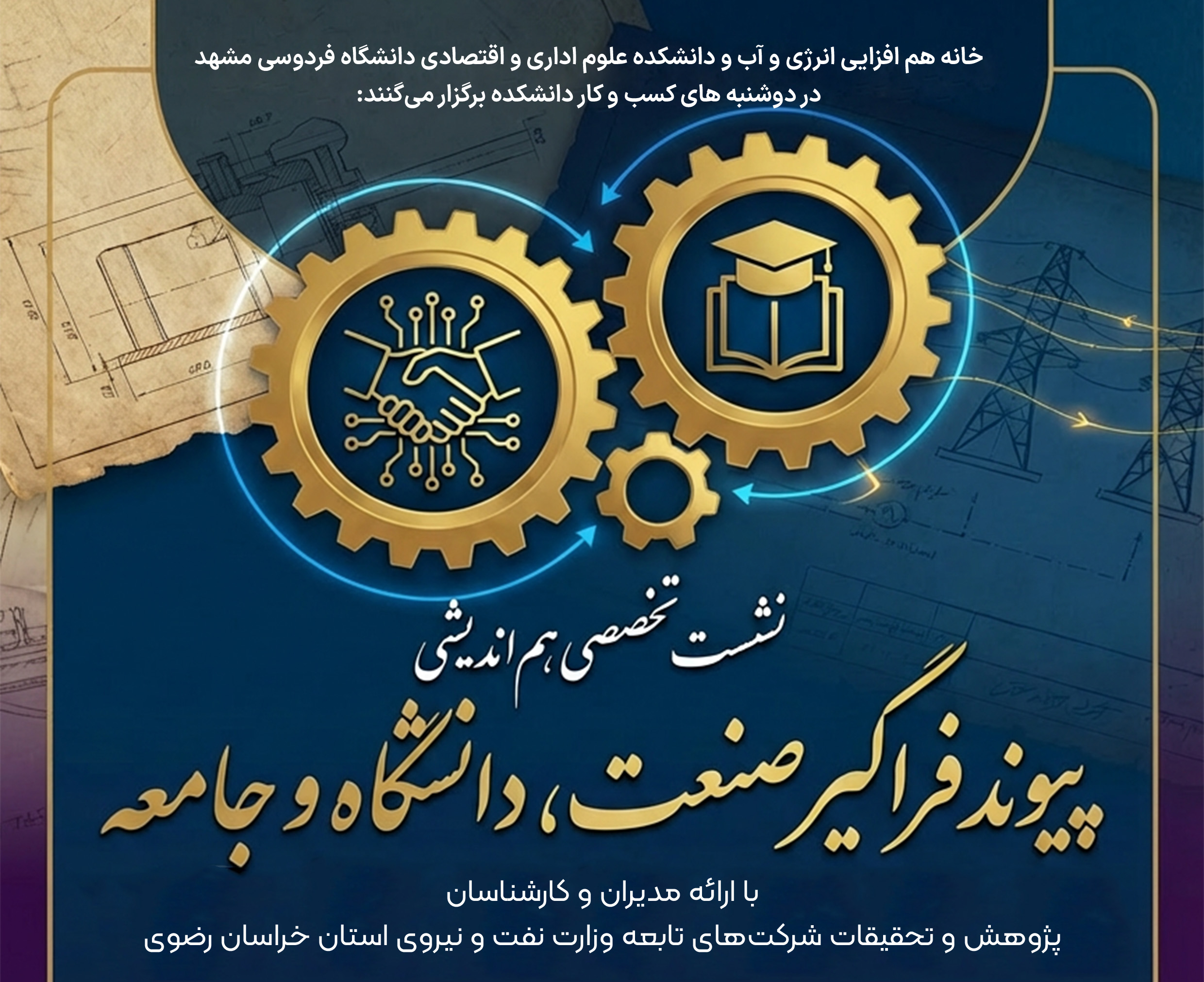 نشست تخصصی هماندیشی «پیوند فراگیر صنعت، دانشگاه و جامعه» با ارائه مدیران و کارشناسان رسته پژوهش و تحقیقات شرکتهای عضو خانه همافزایی انرژی و آب، دوشنبه هشتم دیماه از ساعت ۱۴ تا ۱۶ در تالار فارابی دانشکده علوم اداری و اقتصاد دانشگاه فردوسی مشهد برگزار میشود.