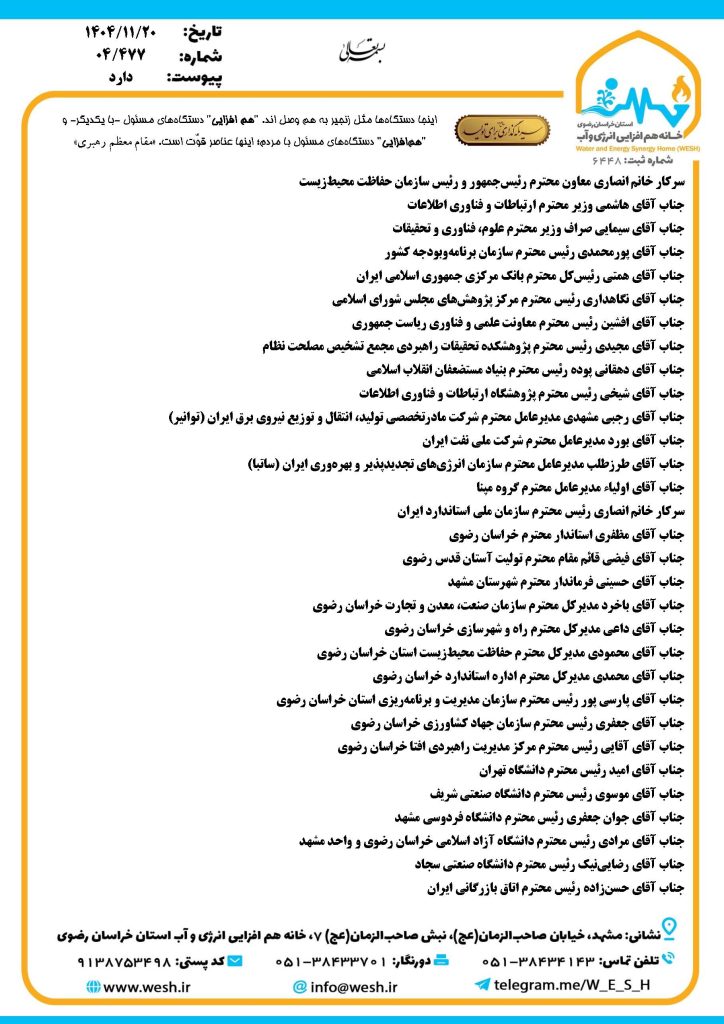 در این مکاتبه که خطاب به معاون رئیسجمهور و رئیس سازمان حفاظت محیطزیست، وزیر ارتباطات و فناوری اطلاعات، وزیر علوم، تحقیقات و فناوری، رئیس سازمان برنامهوبودجه کشور، رئیسکل بانک مرکزی، رئیس مرکز پژوهشهای مجلس شورای اسلامی، رئیس معاونت علمی و فناوری ریاست جمهوری، رئیس پژوهشکده تحقیقات راهبردی مجمع تشخیص مصلحت نظام، رئیس بنیاد مستضعفان انقلاب اسلامی، رئیس پژوهشگاه ارتباطات و فناوری اطلاعات، مدیرعامل شرکت مادرتخصصی تولید، انتقال و توزیع نیروی برق ایران (توانیر)، مدیرعامل شرکت ملی نفت ایران، مدیرعامل سازمان انرژیهای تجدیدپذیر و بهرهوری ایران (ساتبا)، مدیرعامل گروه مپنا، رئیس سازمان ملی استاندارد ایران، استاندار خراسان رضوی و جمعی از مدیران ارشد دستگاههای اجرایی، دانشگاهها، صنایع انرژی، نفت و گاز، آب و برق و نهادهای علمی و پژوهشی کشور انجام شده است.