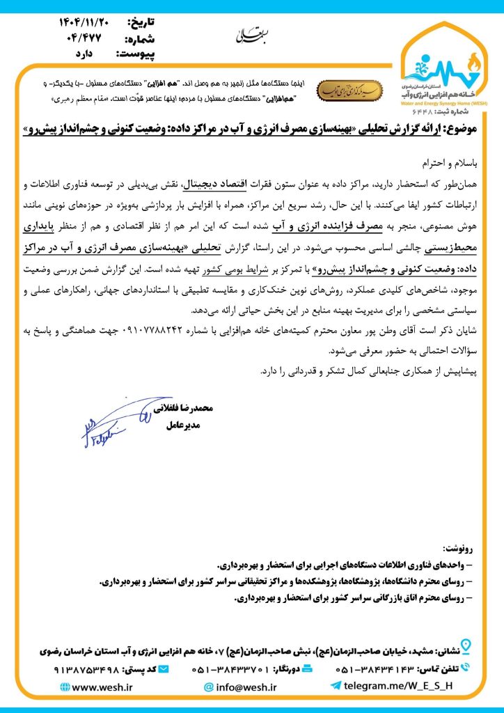 گزارش تحلیلی «بهینهسازی مصرف انرژی و آب در مراکز داده: وضعیت کنونی و چشمانداز پیشرو» با هدف ارائه راهکارهای عملی برای مدیریت مصرف منابع در زیرساختهای دیجیتال کشور، برای جمعی از مسئولان ملی و استانی ارسال شد.